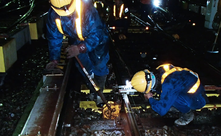 レール溶接した部分に不備があると列車の走行に悪影響を及ぼすため、とても重要な作業です。 -