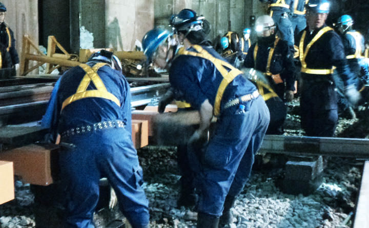 分岐器組立も新設線 軌道敷設の中での一つの作業です。その名の通り、新たに作られた軌道に分岐となるポイントを組み立てていきます。