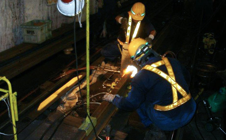 レールガス圧接溶接とは2本のレールを繋ぎ合わせ、繋げ合わせた部分を酸素/アセチレンの炎により加熱し1本のレールにする作業です。